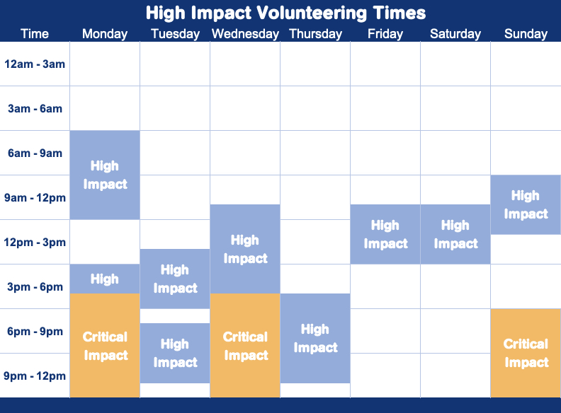 Our service operates 24/7 to meet the demand of our help seekers. The service experiences key peak times. Volunteers are currently required in the high impact and critical impact times and days shown in the table below. As you are considering volunteering with Lifeline, we would appreciate you considering these times and days to ensure our service continue to serve our help seekers in these key peak times.